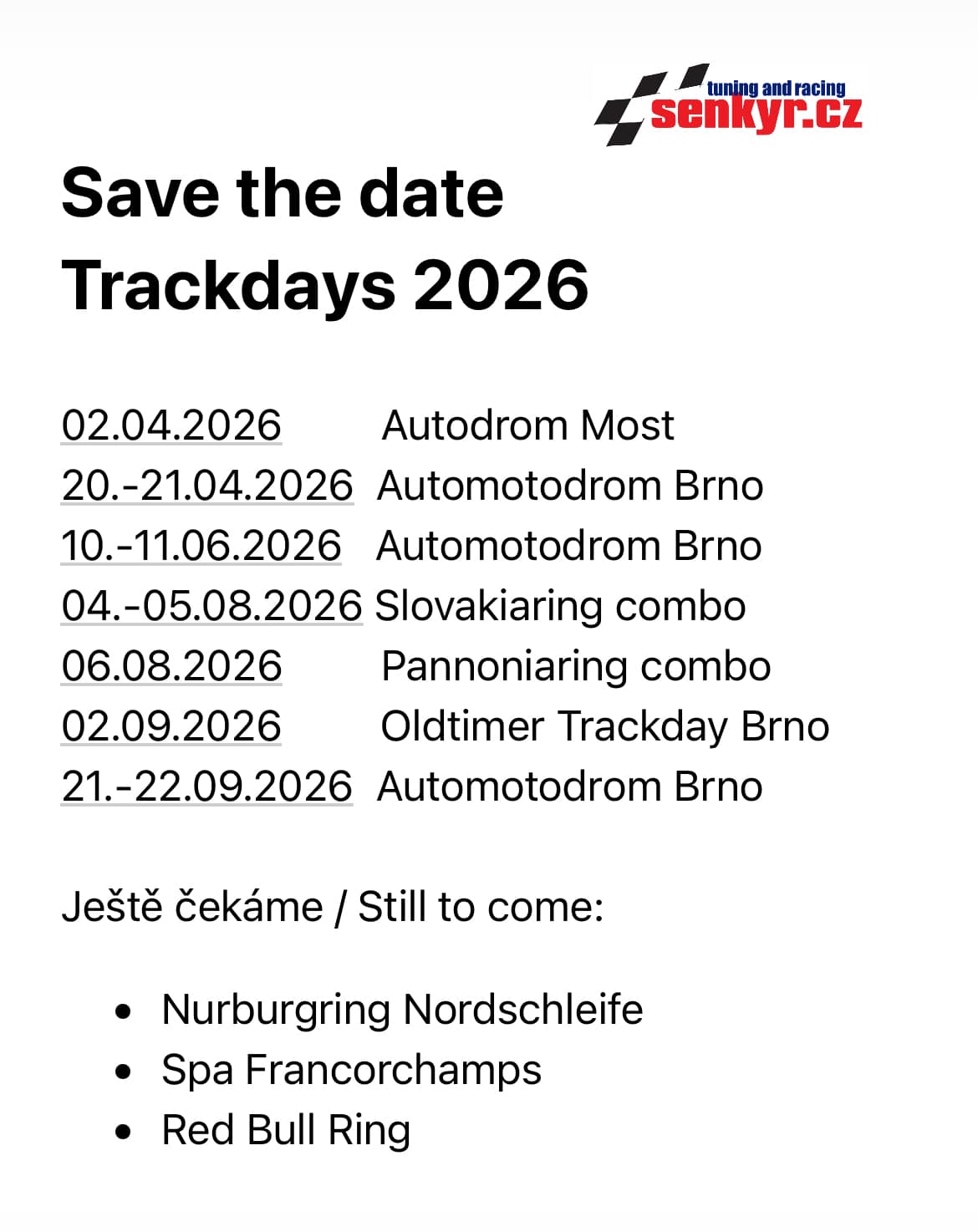 With Šenkýř Motorsport you can visit many destinations in seven European countries, with each race track always bringing you different experiences and experiences. While on some you will enjoy big track days with driving on exclusively rented circuits or with coaching, on others you will be trained in driving skills for safer driving.